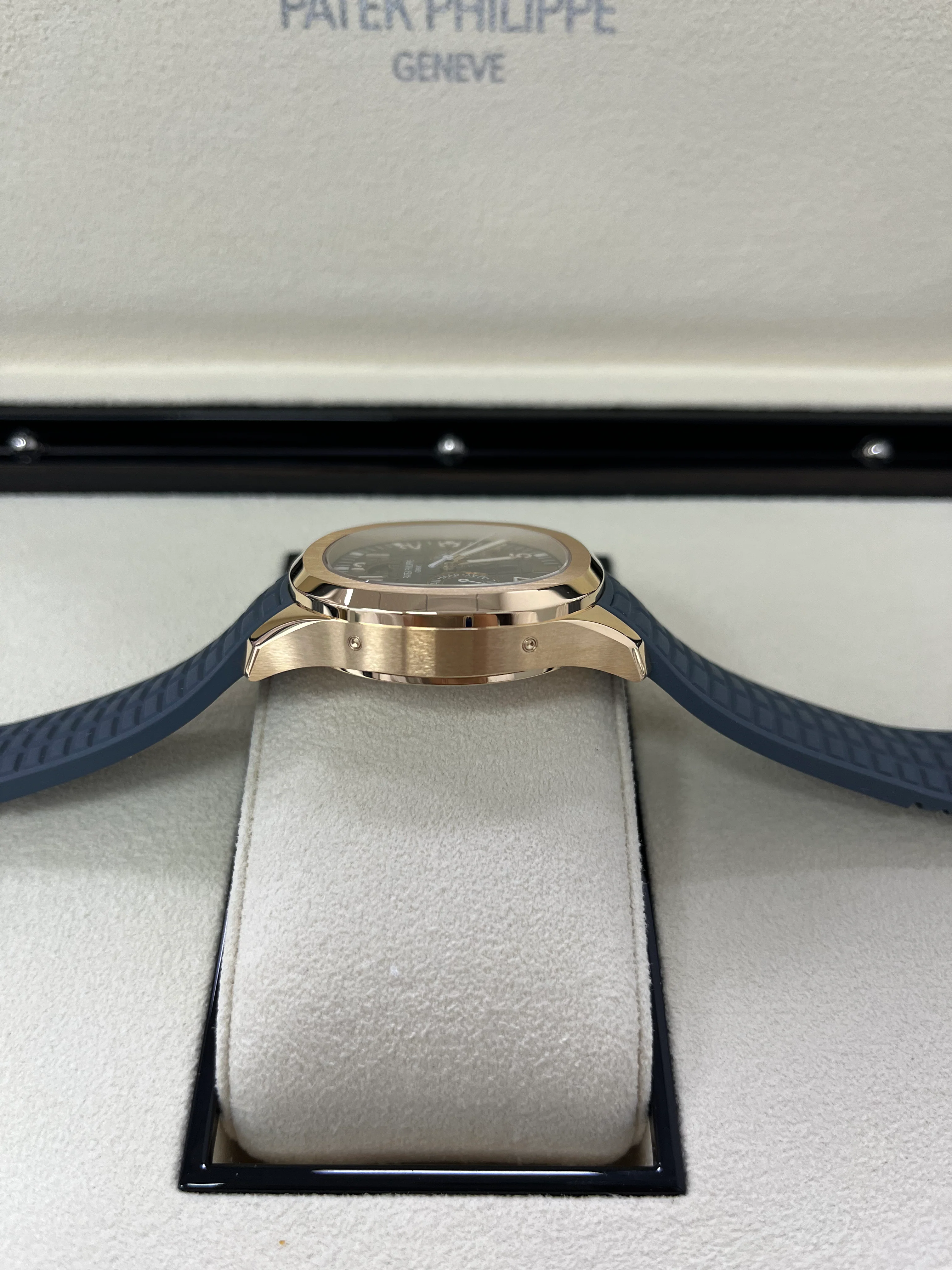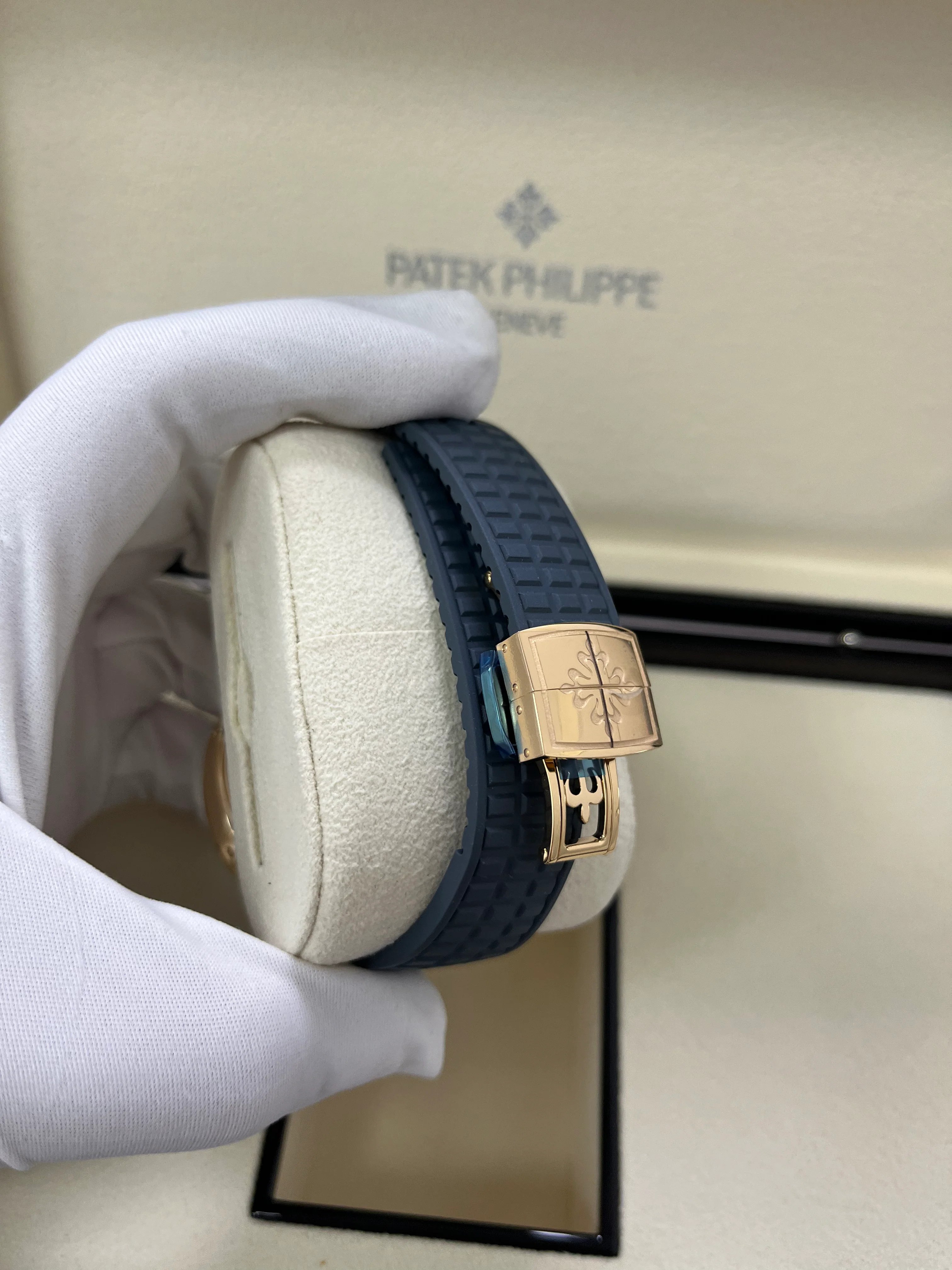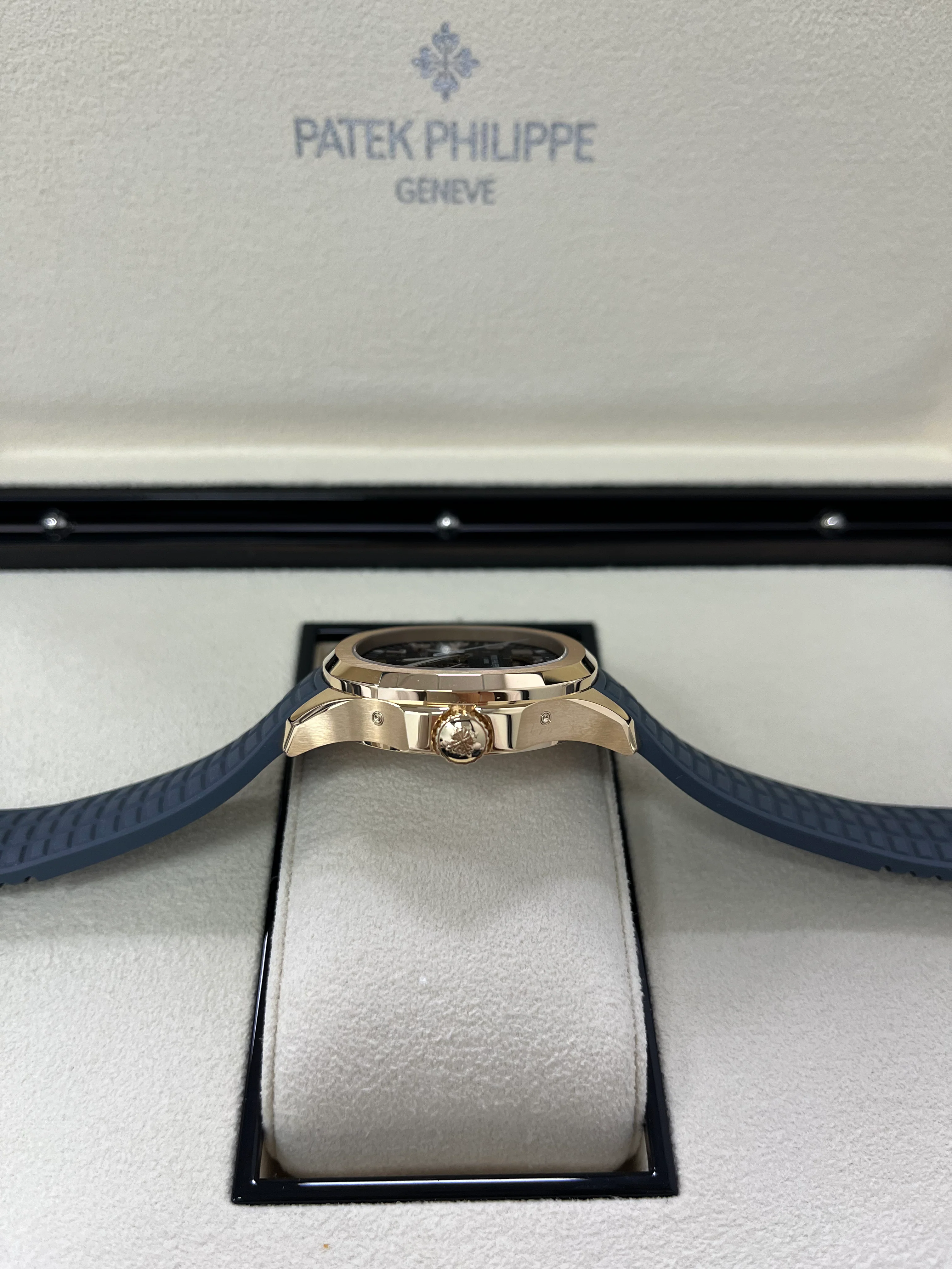 This new Patek Philippe Ladies Aquanaut features the patented Annual Calendar: a complete day/date/month calendar requiring only one manual correction per year, at the end of February. The iconic design of the 39.9mm rose gold case and bezel with a rounded octagonal shape is enhanced by the contrast between polished and satin-brushed finishes. The contemporary “sporty chic" style is reinforced by the blue-gray dial and composite strap with Aquanaut pattern.