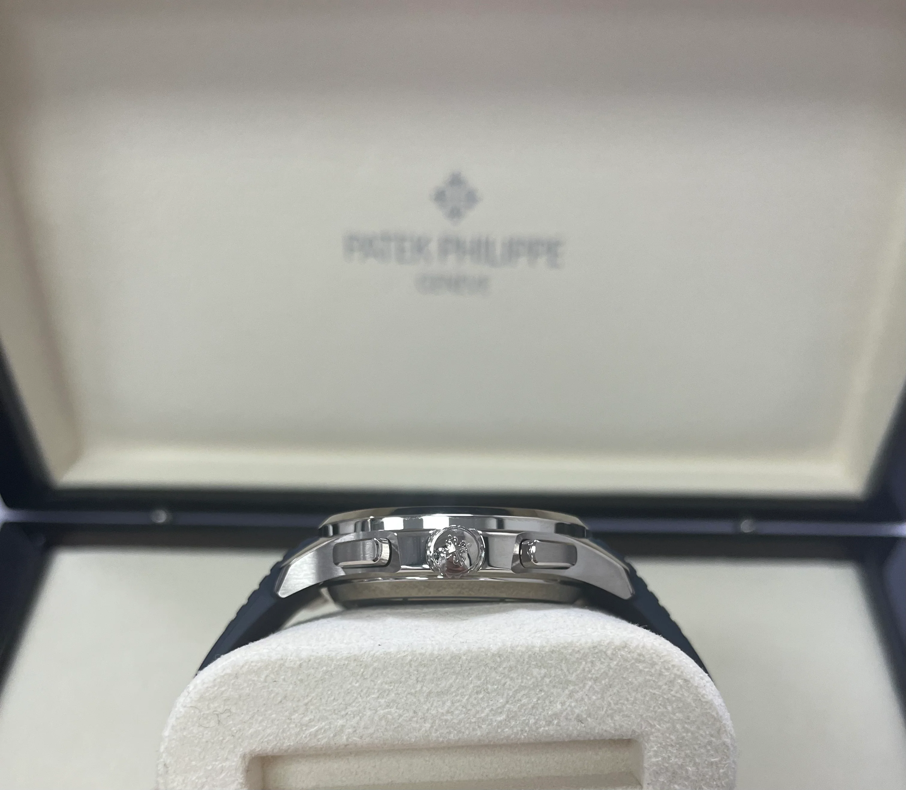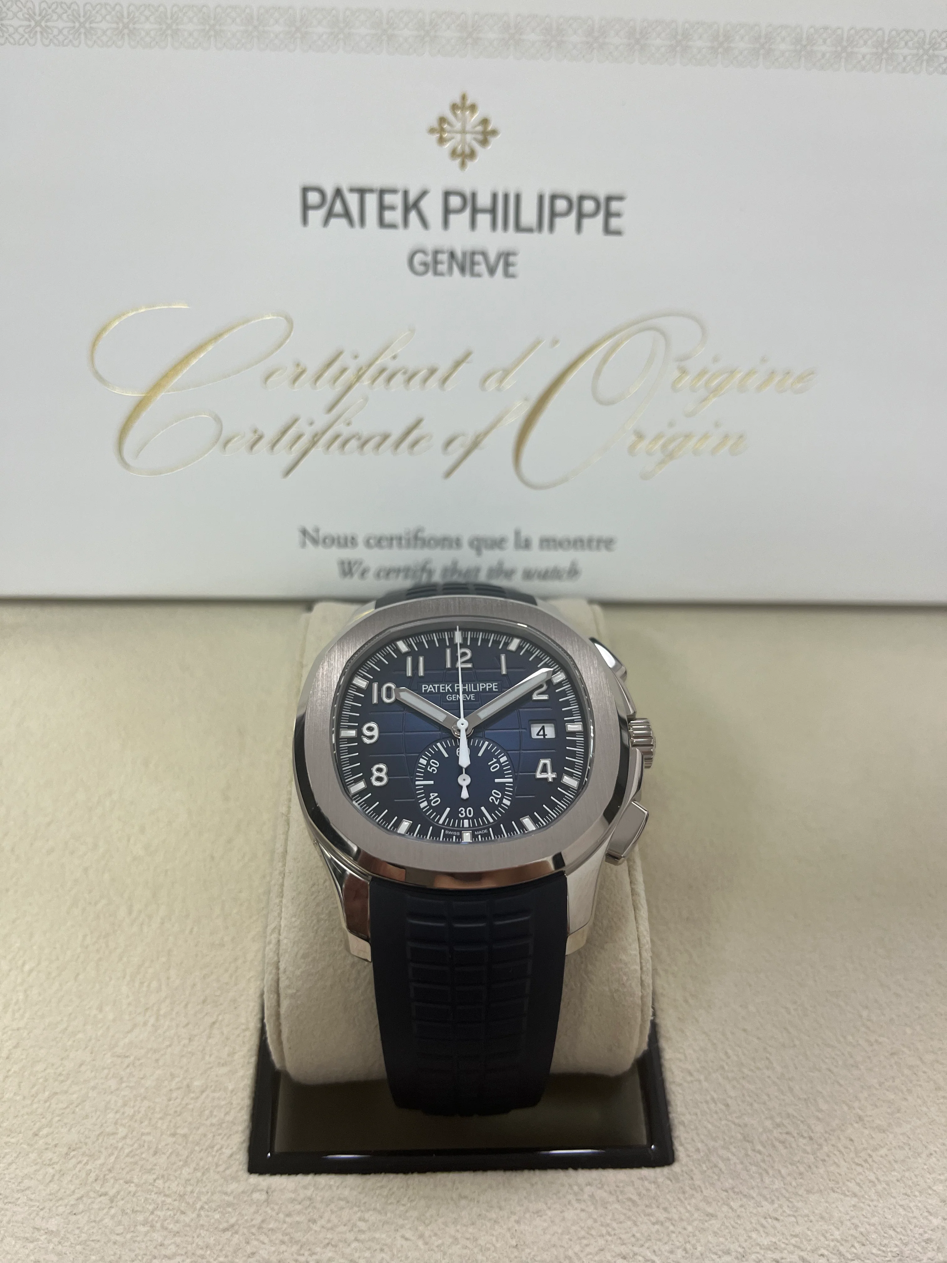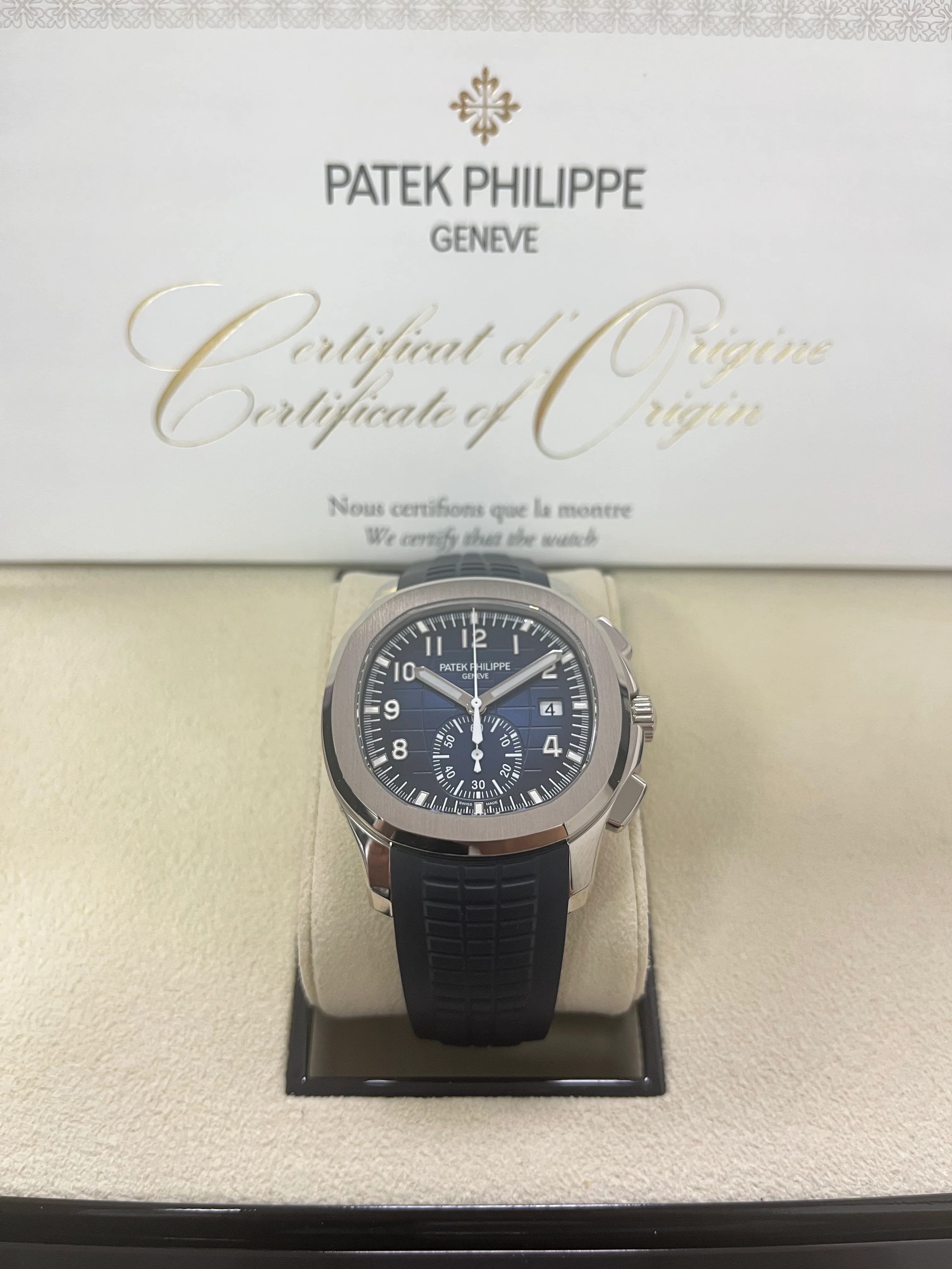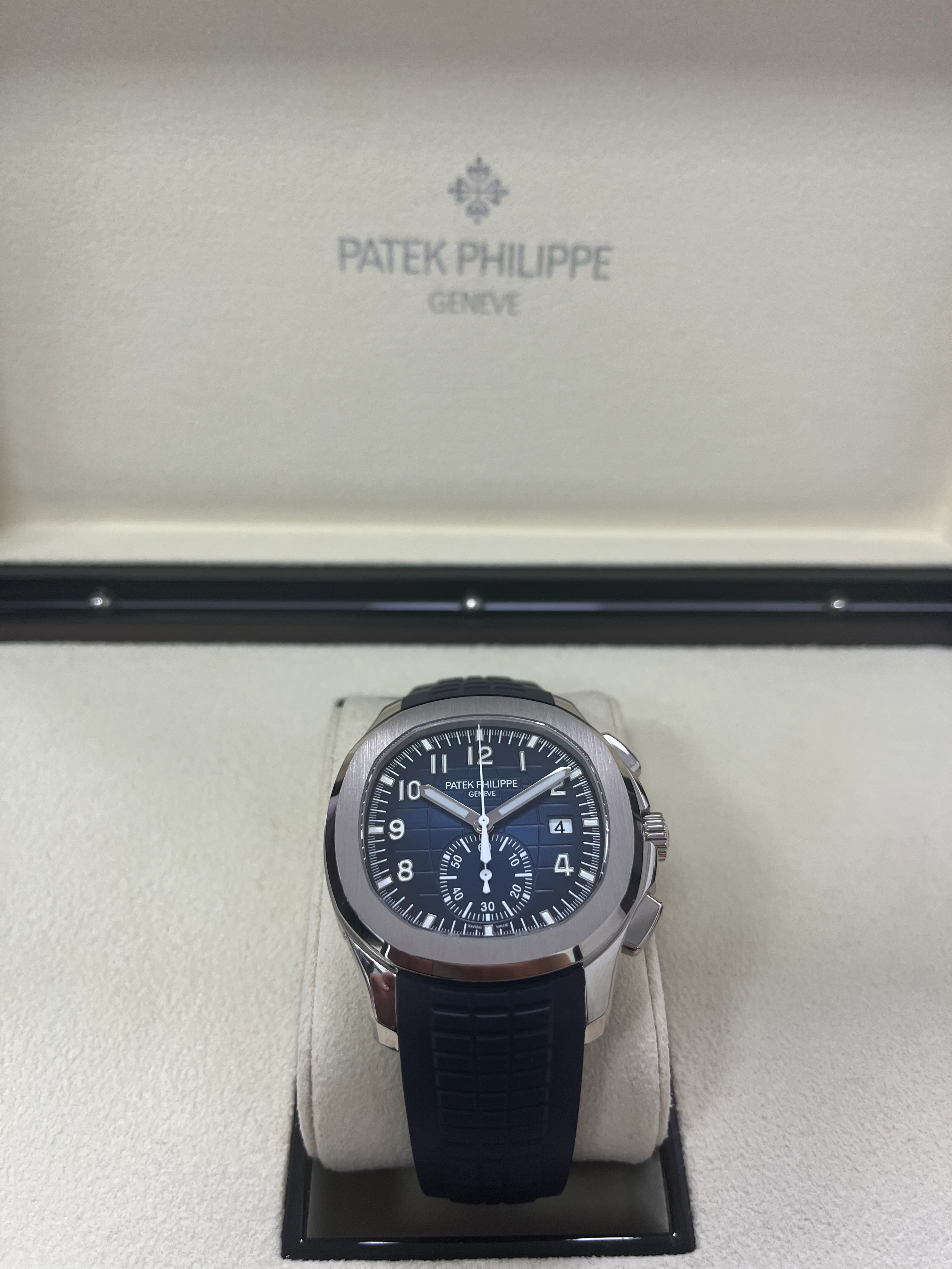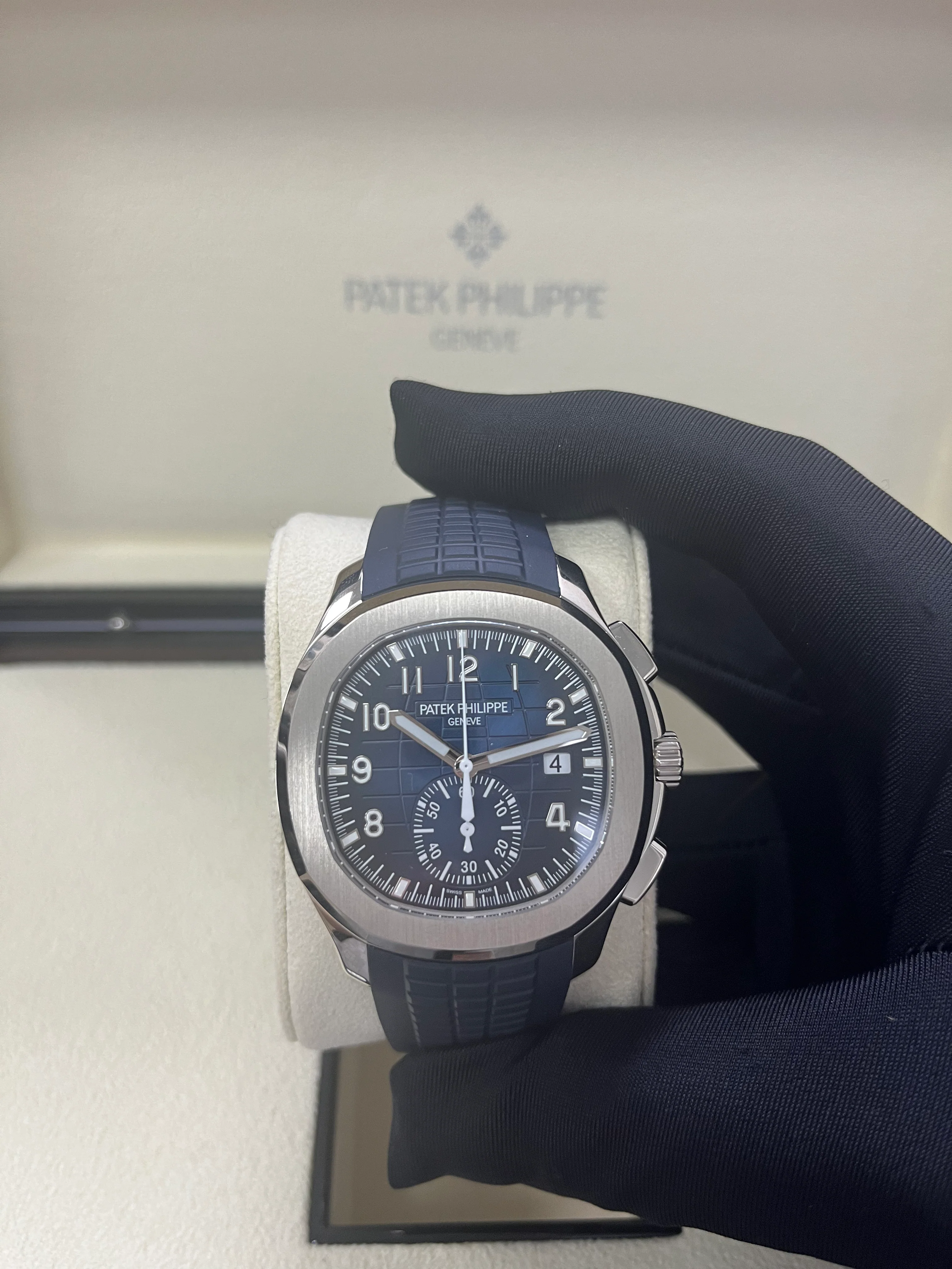 Patek Philippe is reasserting the "contemporary casual chic" spirit of the Aquanaut flyback chronograph with the first white gold version of this self-winding model, combined with an elegant midnight blue color for the dial and matching composite strap. The dial is enlivened by a black-gradient rim. Water-resistant to 120 m, the case is enhanced by polished and satin finishes. The 60-minute counter at 6 o'clock picks up the rounded octagonal shape of the bezel. The patented fold-over clasp is secured by four independent catches