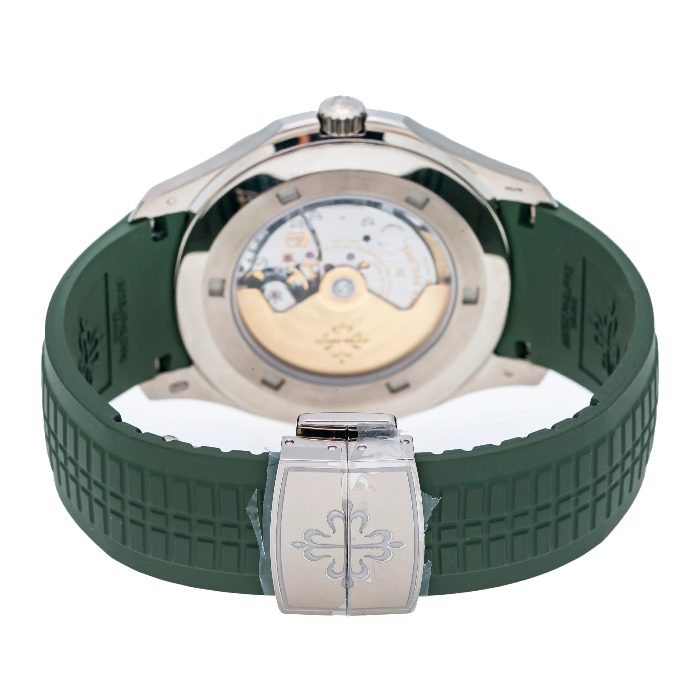 42.2 mm white gold case, 8.25 mm thick, sapphire-crystal back, khaki green embossed dial with gold applied numerals with luminescent coating, caliber 324 S C self-winding movement with date in an aperture, sweep seconds hand, approximately 35-45 hours of power reserve, Khaki Green composite material strap, aquanaut fold-over buckle. Water-resistant up to 120 meters.