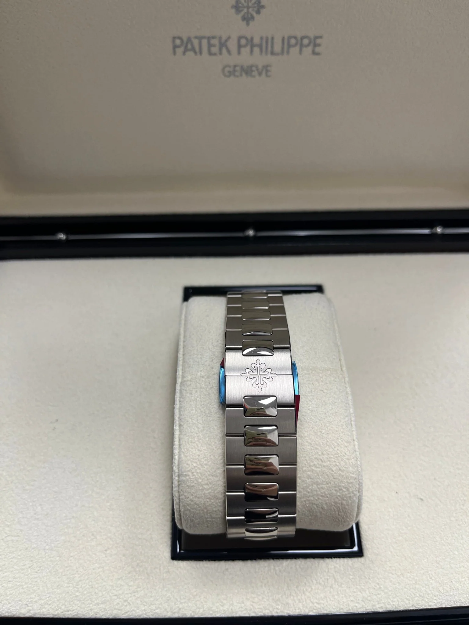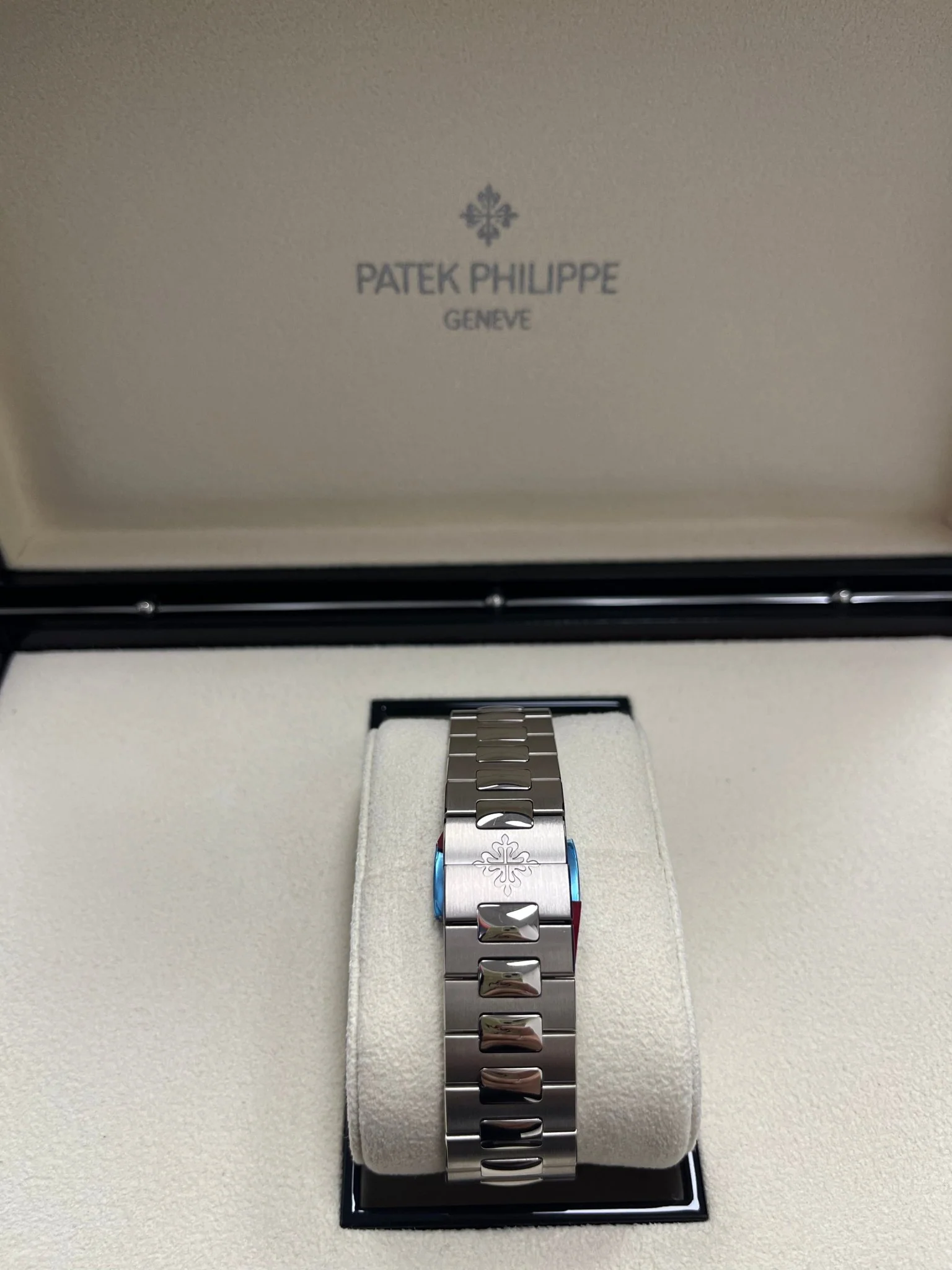 Water-resistant to 120 m and with a slightly enlarged diameter to 41 mm, the watch reflects its affinity with the original Nautilus of 1976 with a two-part case. It also features several subtle technical refinements and patented innovations: a secured fold-over clasp, a new lockable adjustment system, and a new pull-out piece lever system that replaces the split stem.