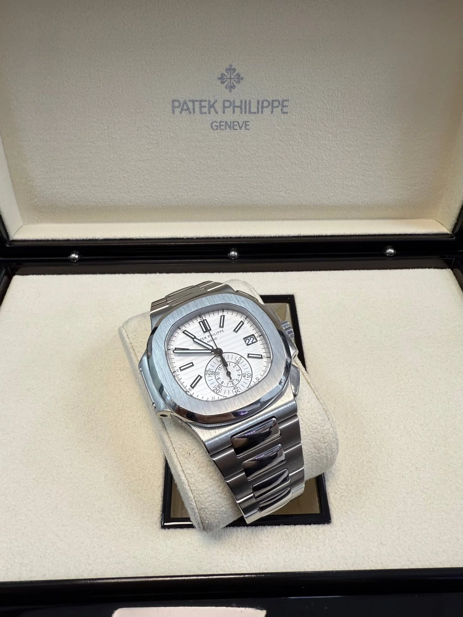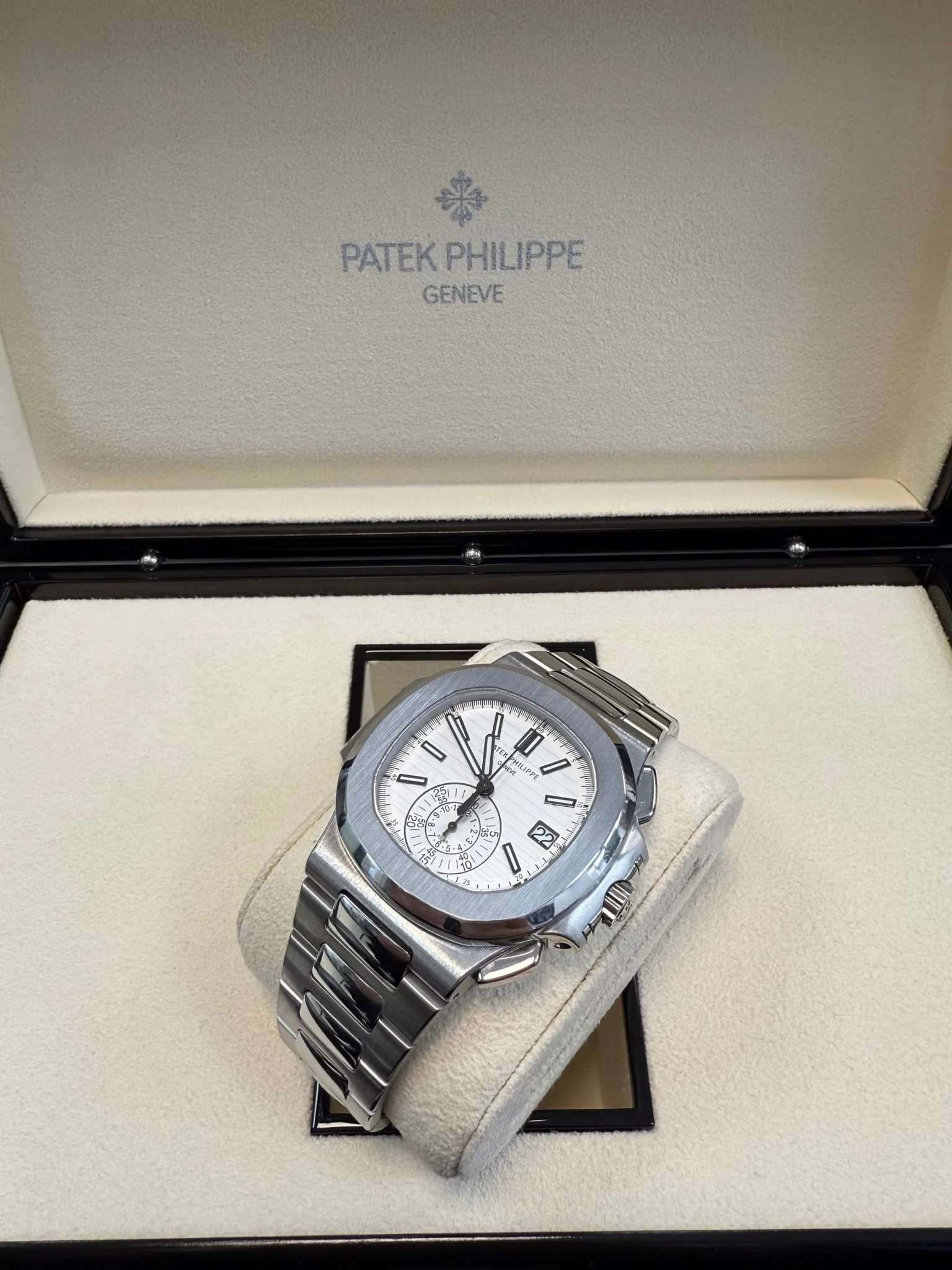 Patek Philippe Nautilus Chronograph (ref. 5980/1A), featuring a mechanical automatic movement; white dial; chronograph complication with 60-minute and 12-hour counters together in a single elegant monocounter at 6 o'clock; date display at 3 o'clock; center sweep seconds hand, which also serves as the chronograph hand; and 40.5mm, stainless steel case with an integrated stainless steel, Nautilus-style bracelet.
