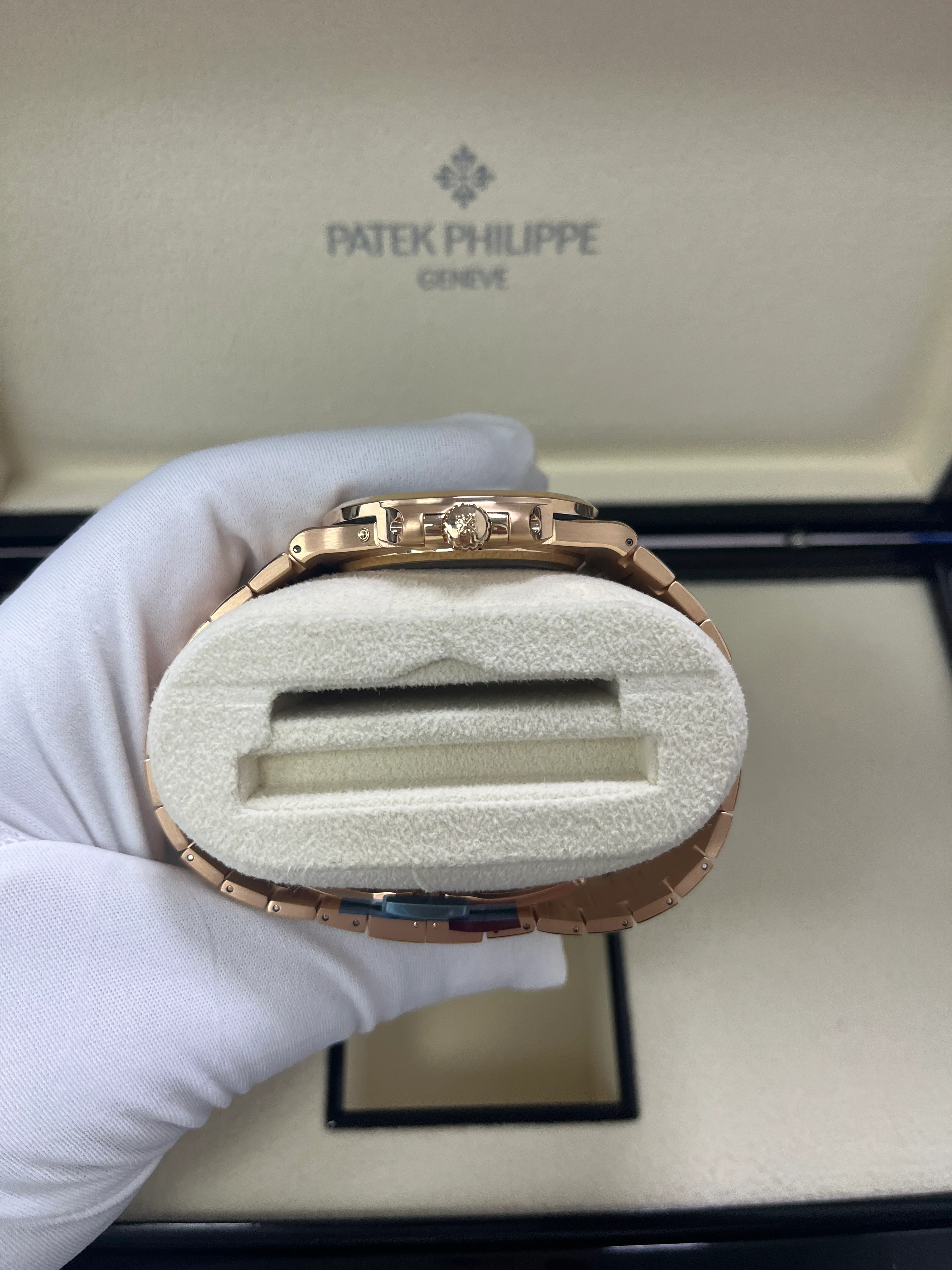 The famous Ref. 5712/1R-001 Nautilus with an analog date, moon phases, and a power-reserve indicator presents sporty appeal and elegance; it features a case and bracelet in rose gold with a brown sunburst dial and a black gradation.