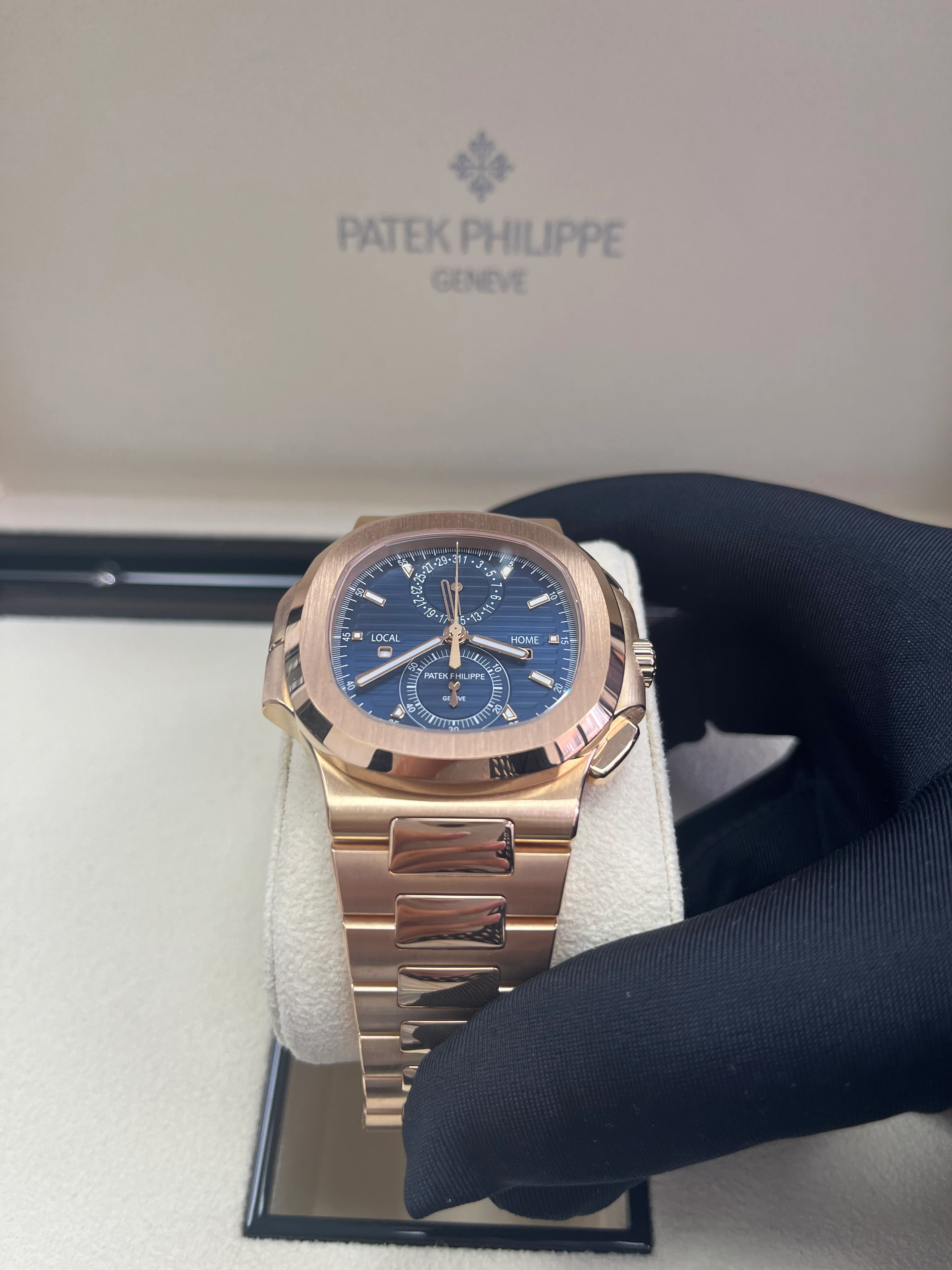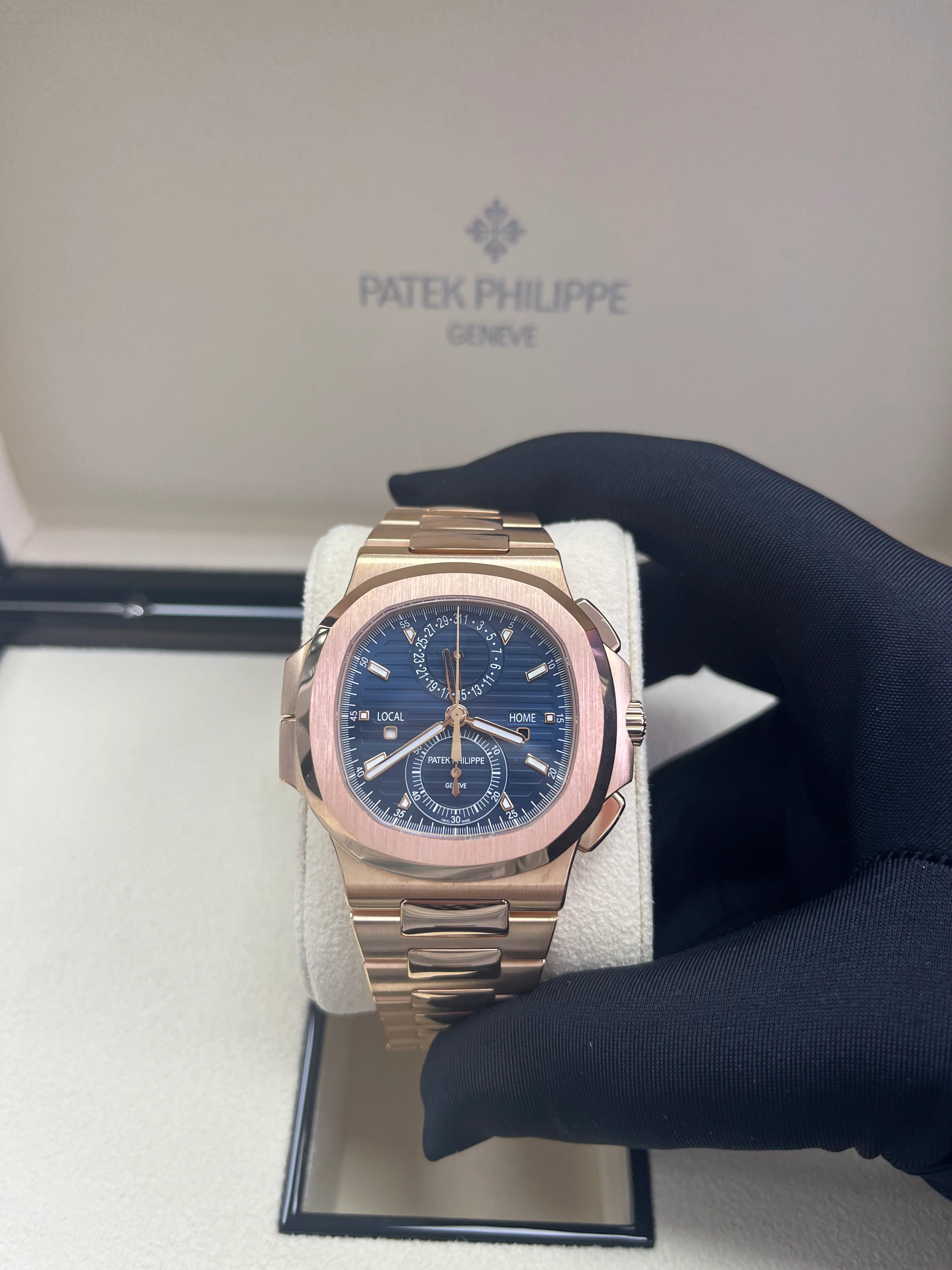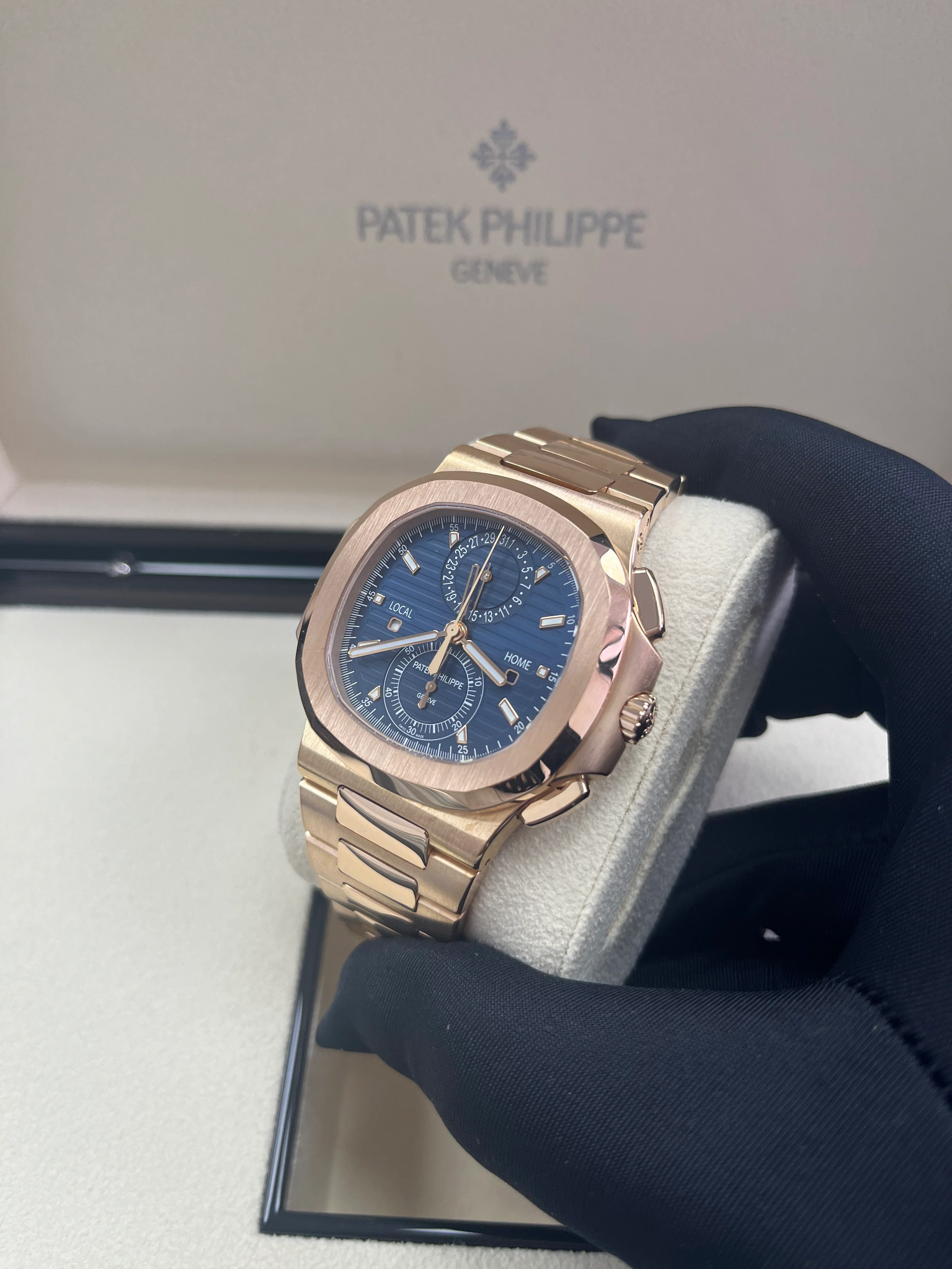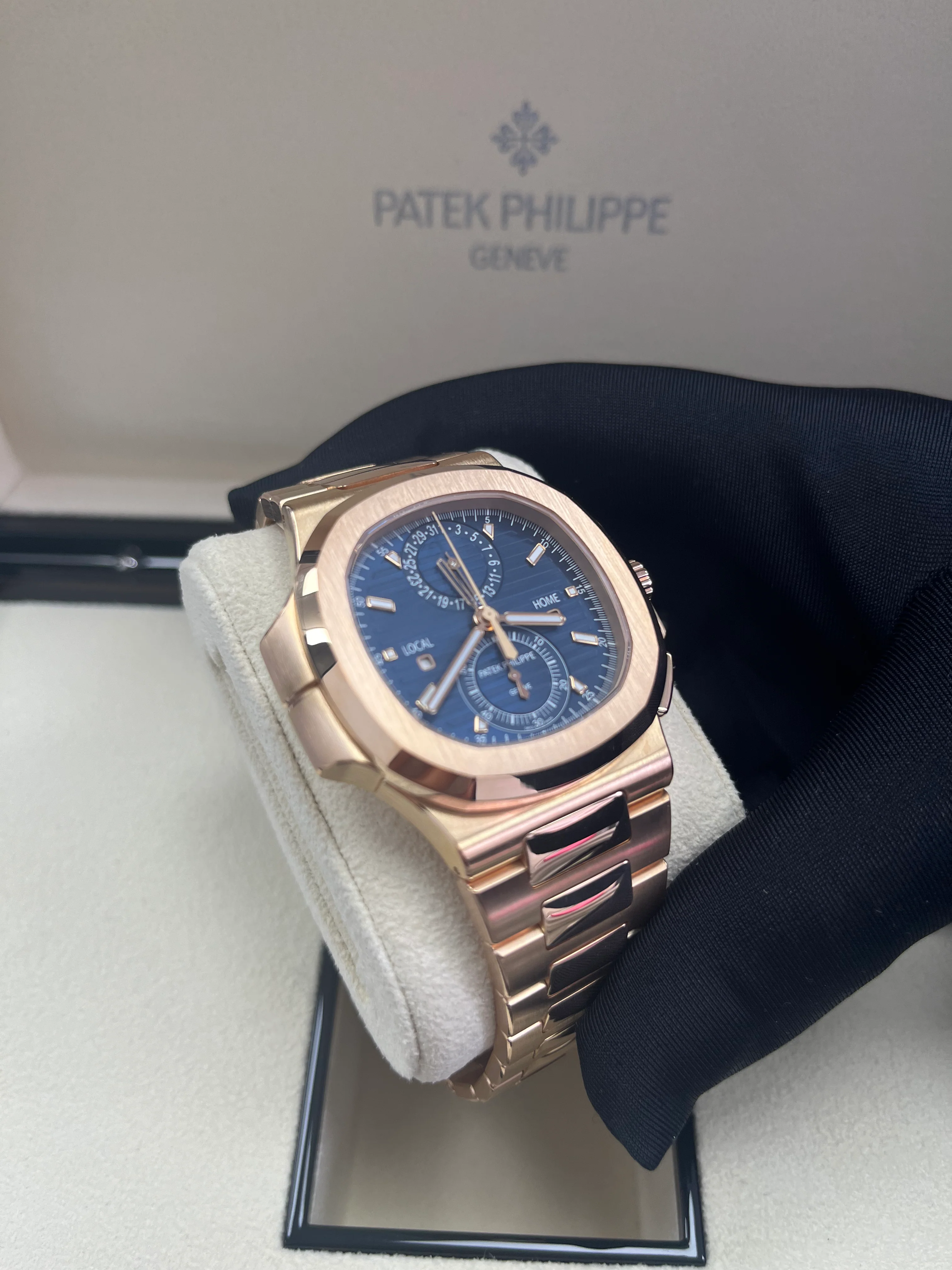 Patek Philippe presents the Nautilus Travel Time Chronograph in a generous rose gold version contrasting with the sunburst blue dial featuring an embossed horizontal pattern and applied hour-markers. The baton-style hands are in rose gold with a luminescent coating. This model combines three highly sought-after complications: a self-winding flyback chronograph, an easy-to-use Travel Time function (dual time-zone), and a date display, coupled with local time.