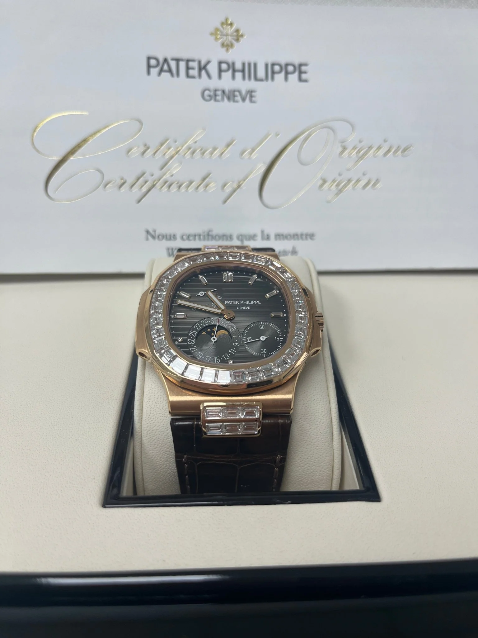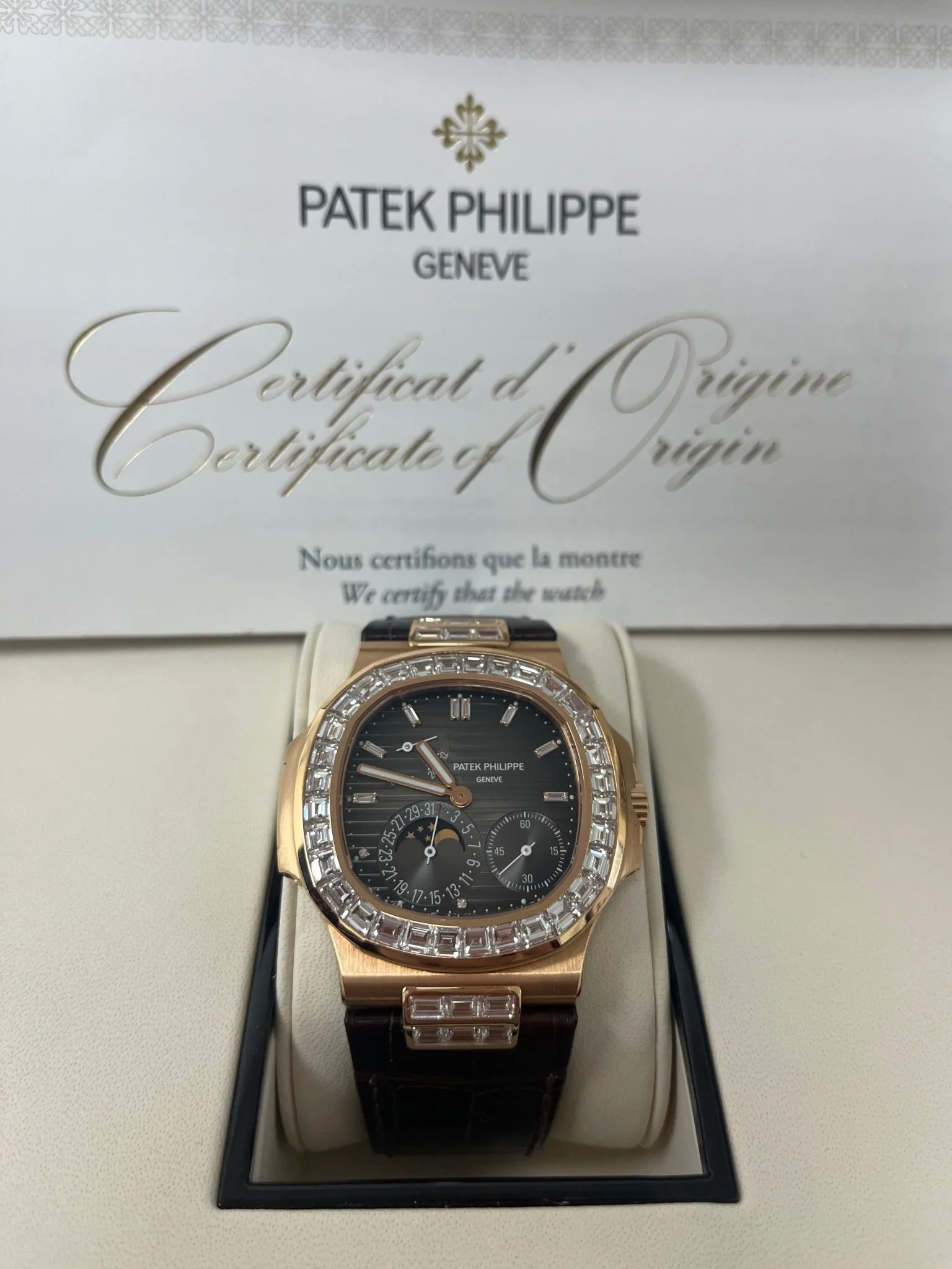 Patek Philippe Nautilus Rose Gold Diamond Bezel & Moon Phase Brown Dial 5724R 001
