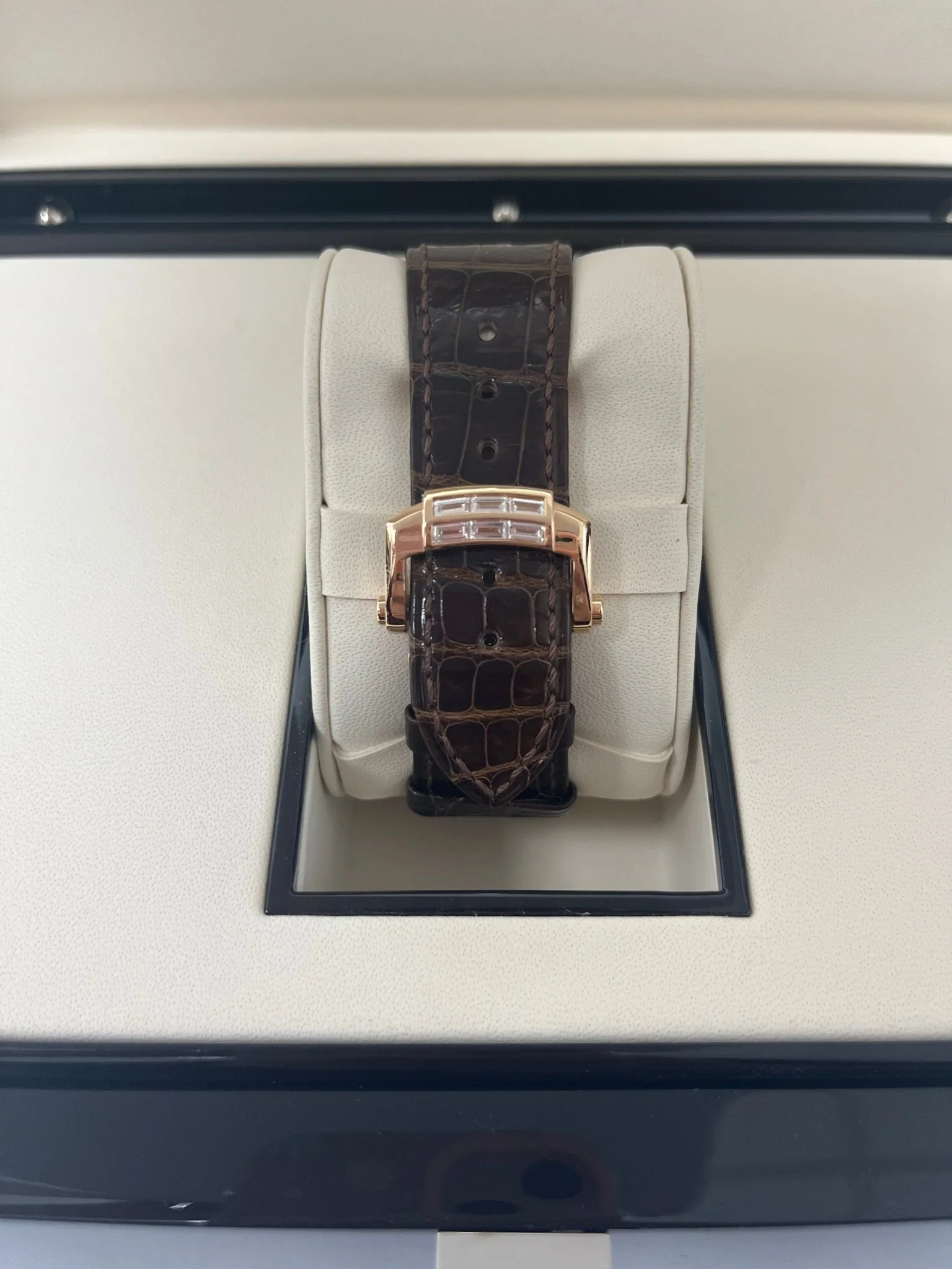 40mm 18K rose gold case set with diamonds, sapphire crystal back, screw-down crown, black dial with gold applied hour markers with luminescent coating, self-winding caliber 240 PS IRM C LU movement with power reserve, date by hand, moon phases, seconds subdial, approximately 48 hour of power reserve, leather strap with Nautilus fold-over buckle. Water resistant to 120 meters.